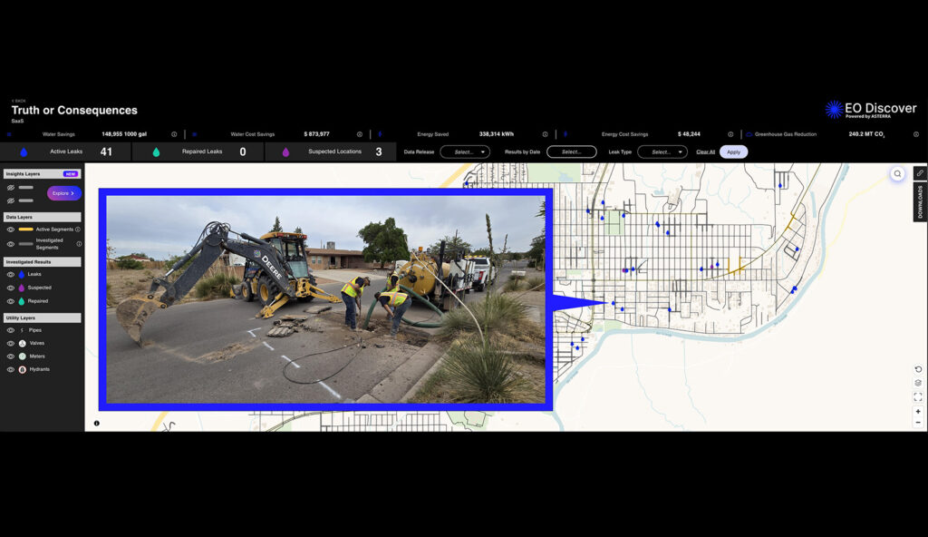 Satellite-guided leak detection uses L-Band synthetic aperture radar (SAR) to detect soil moisture anomalies of potable water underground. These areas of interest (AOIs) are then confirmed by traditional boots-on-the-ground (BOTG) leak detection crews.
